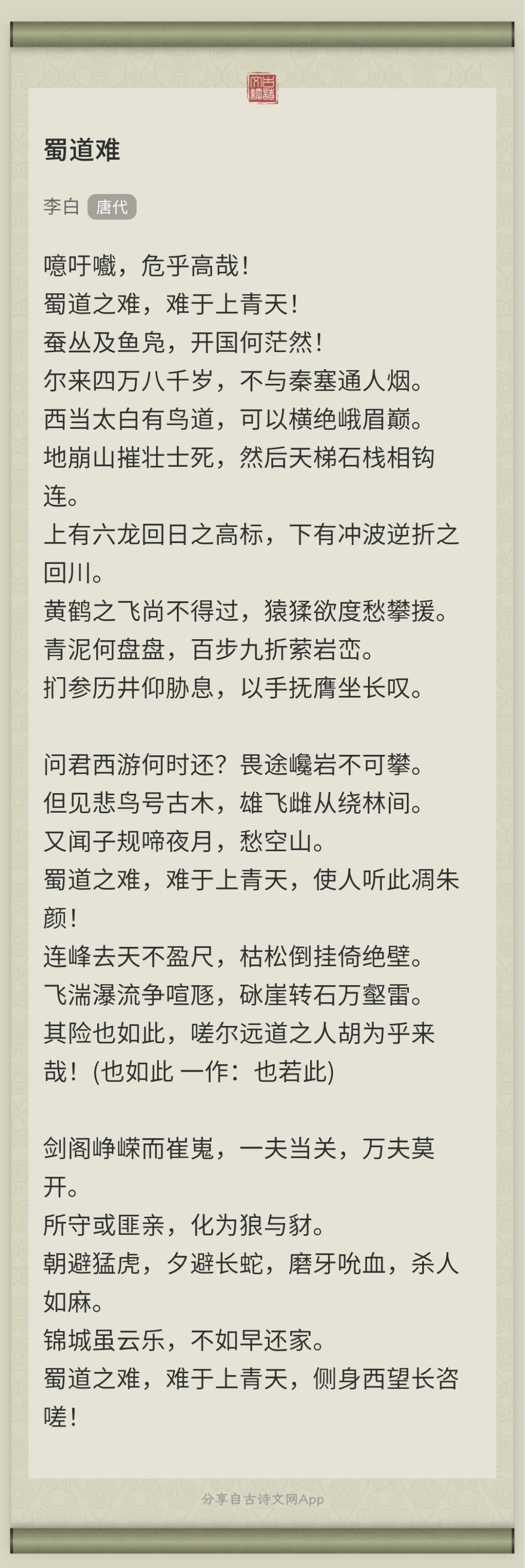 噫吁嚱,危乎高哉!蜀道之难,难于上青天!