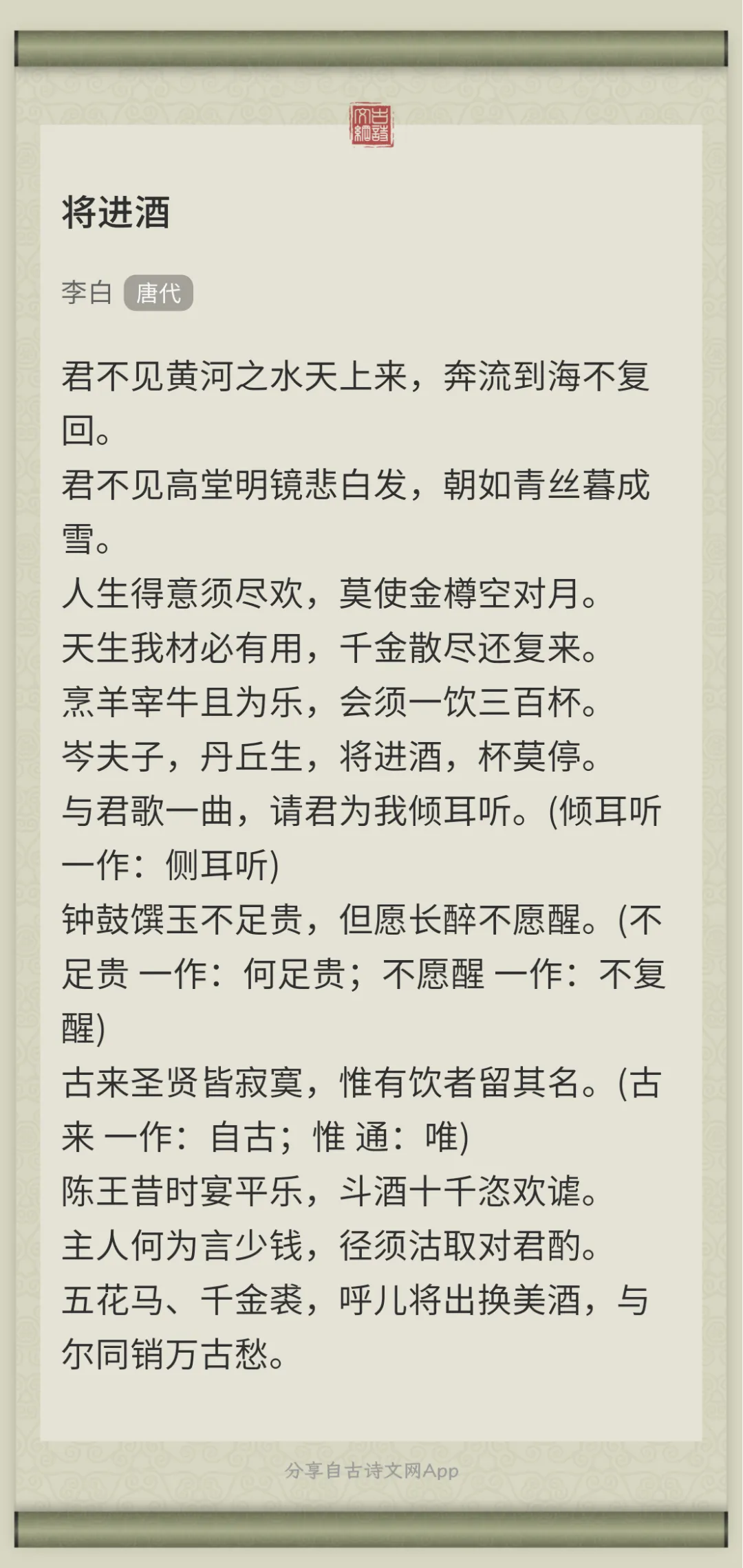 “黄河之水天上来”的雄浑开篇,化作“千金散尽还复来”的豪情,终凝于“与尔同销万古愁”的宇宙悲慨。