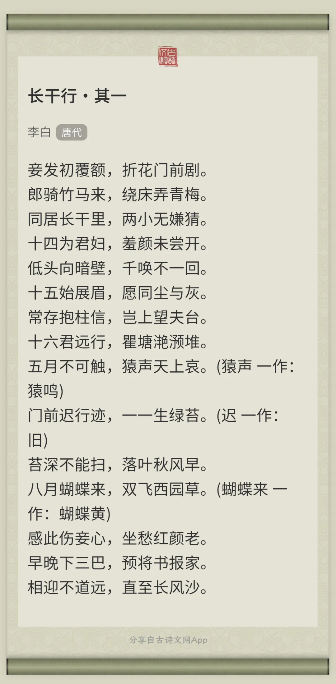 以女子口吻追忆爱情成长史,“青梅竹马”成千古爱情符号。细腻温婉,与李白豪放形象形成奇妙反差。