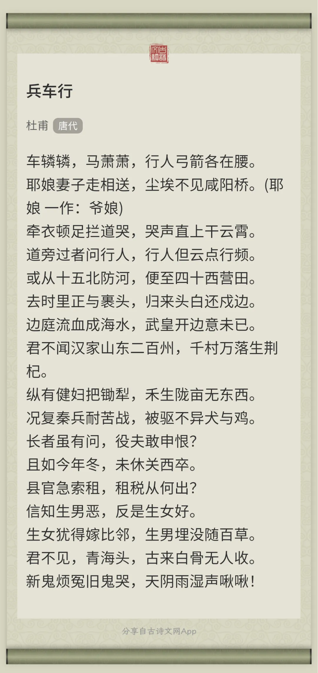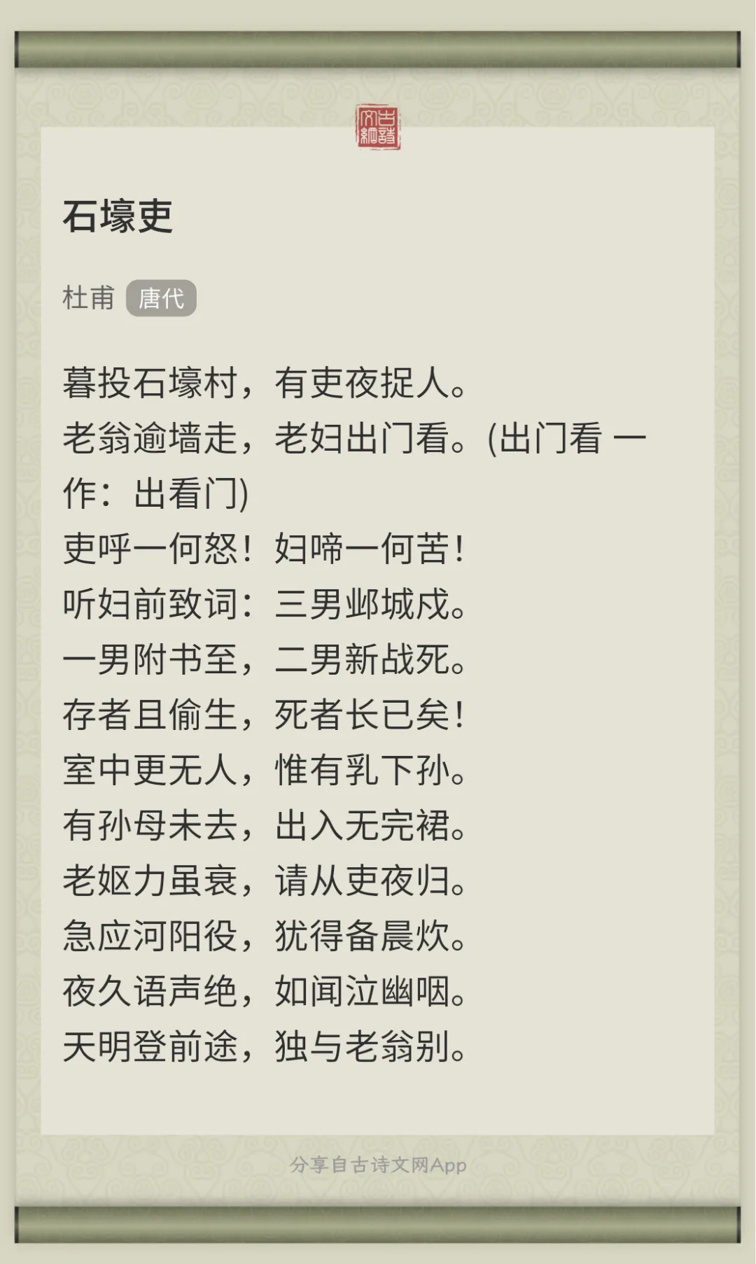 “三吏三别”之一,白描战乱中百姓被征兵的惨状。无一句议论,却字字泣血。