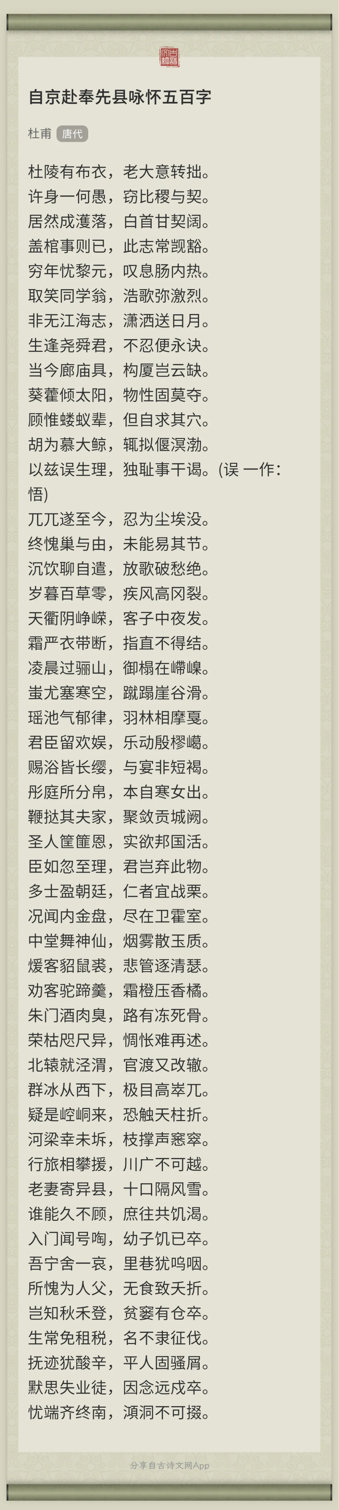 安史之乱前夕,杜甫亲历社会撕裂。此诗如一部微型《离骚》,融个人命运与国家危亡于一体。