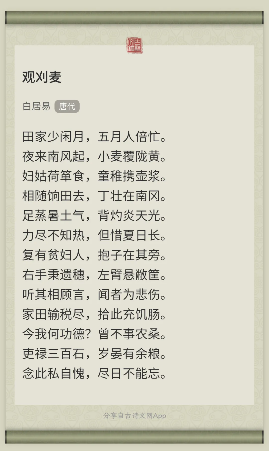 新乐府代表作,聚焦农妇拾穗之苦,直指赋税之苛。语言平实,震撼力却不减。