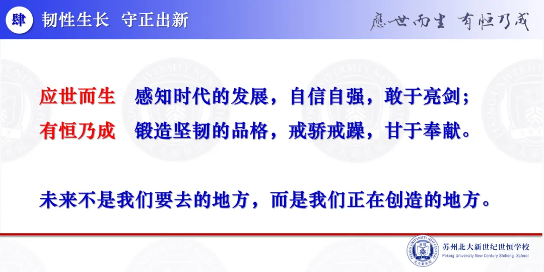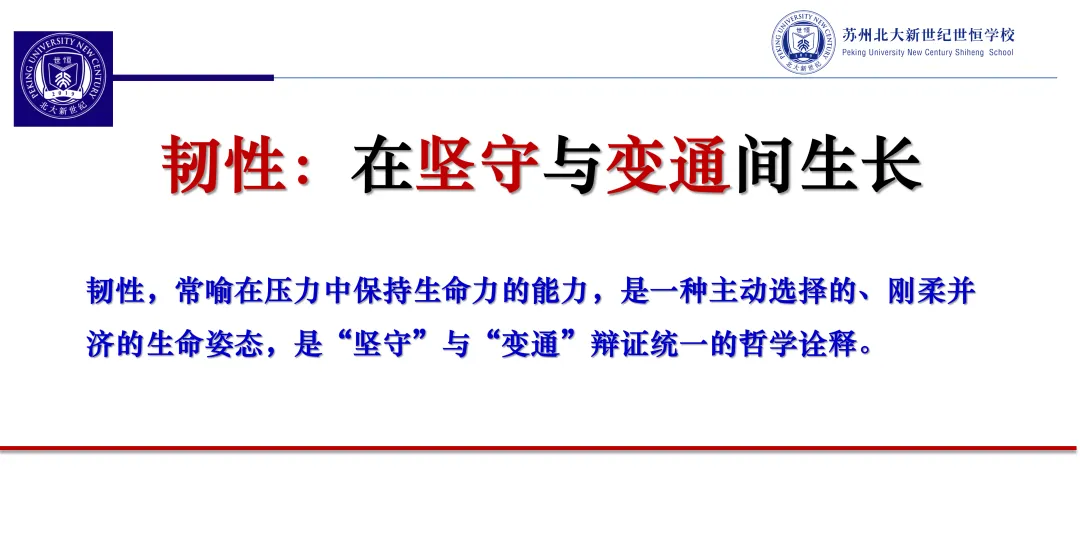 “今天的两个关键词,一个是‘坚守’,一个是‘变通’。坚守是‘定力与方向之锚’,变通是‘活力与实现之桥’。我们既要坚守本质,又要有变通的智慧,二者相辅相成:坚守为变通划定红线,变通为坚守创造条件。我们要学会‘在坚守和变通中成长’——这恰恰暗合了学校的八字格言‘应世而生 有恒乃成’。‘应世而生’,要求我们顺应时代的发展,顺势而为,具备变通的智慧;‘有恒乃成’,要求我们葆有坚守的定力,即‘立恒远之志’‘养恒定之心’‘修恒学之为’。”