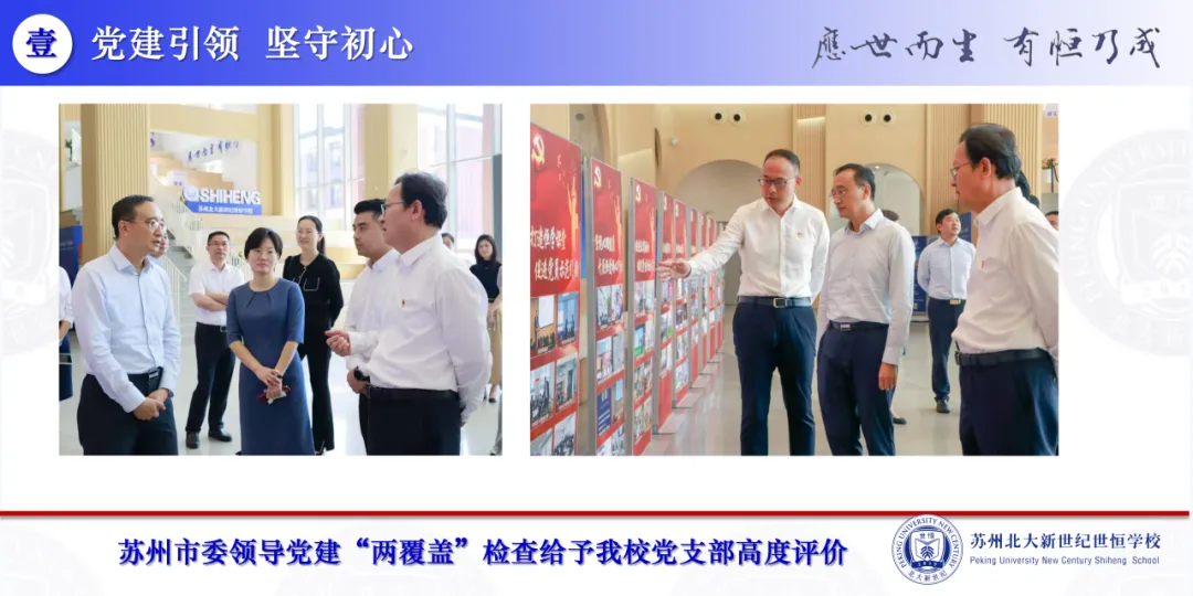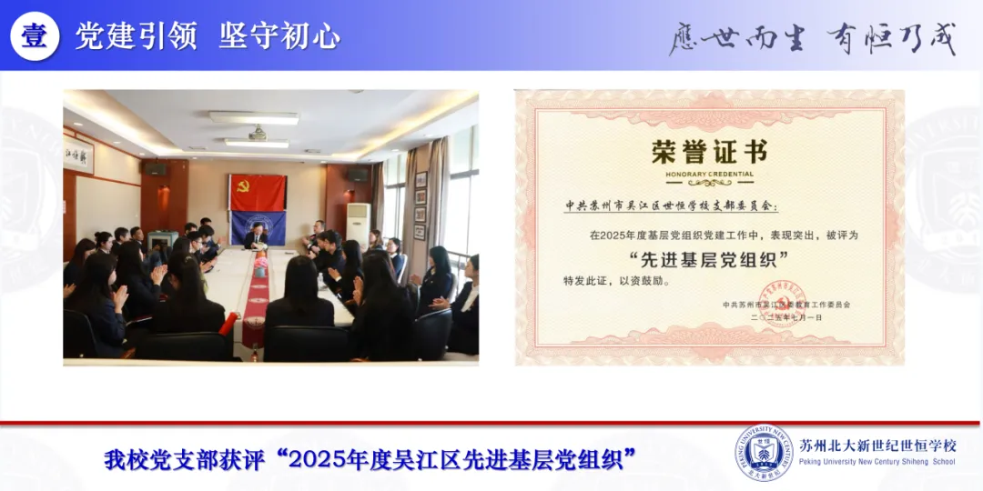 “本学期,学校党建工作在规范上坚守,从结合上创新。苏州市委领导党建‘两覆盖’检查给予我校党支部高度评价。我校党支部获评‘2025年度吴江区先进基层党组织’。”