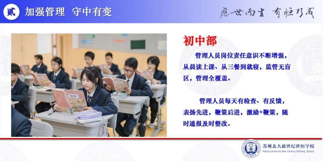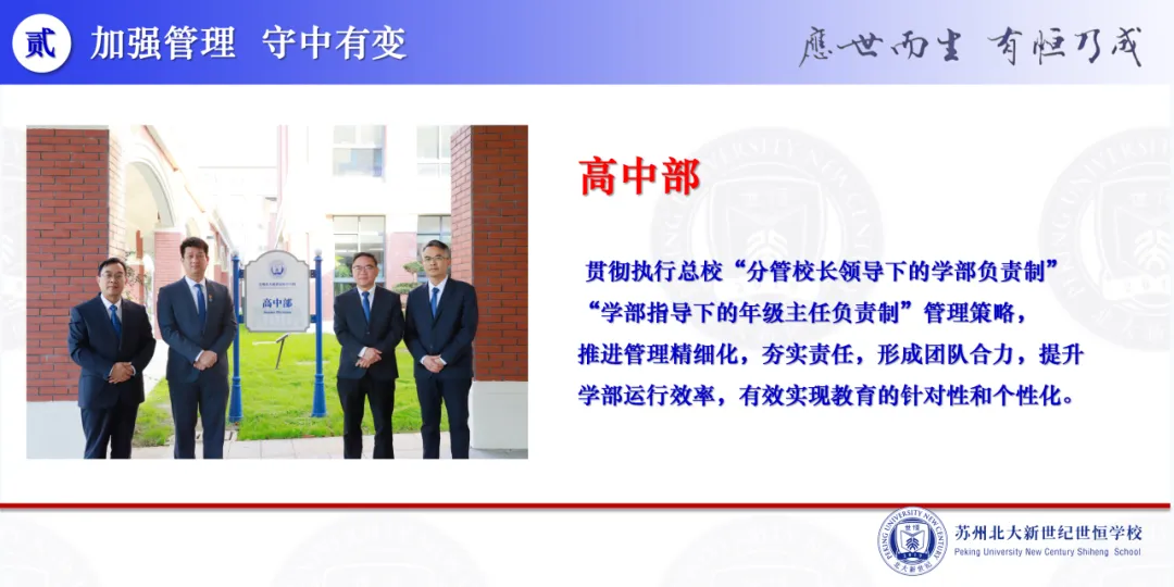 “常规管理常抓不懈,重心下移,执行力得到强化。本学期初高中两个学部的日常管理涌现出不少亮点。初中部管理人员岗位责任意识不断增强,管理‘在现场’,时效性得到加强。本学期,高中部贯彻执行总校‘分管校长领导下的学部负责制’和‘学部指导下的年级主任负责制’管理策略。推进管理精细化,夯实责任,形成团队合力,提升学部运行效率,有效实现教育的针对性和个性化。”