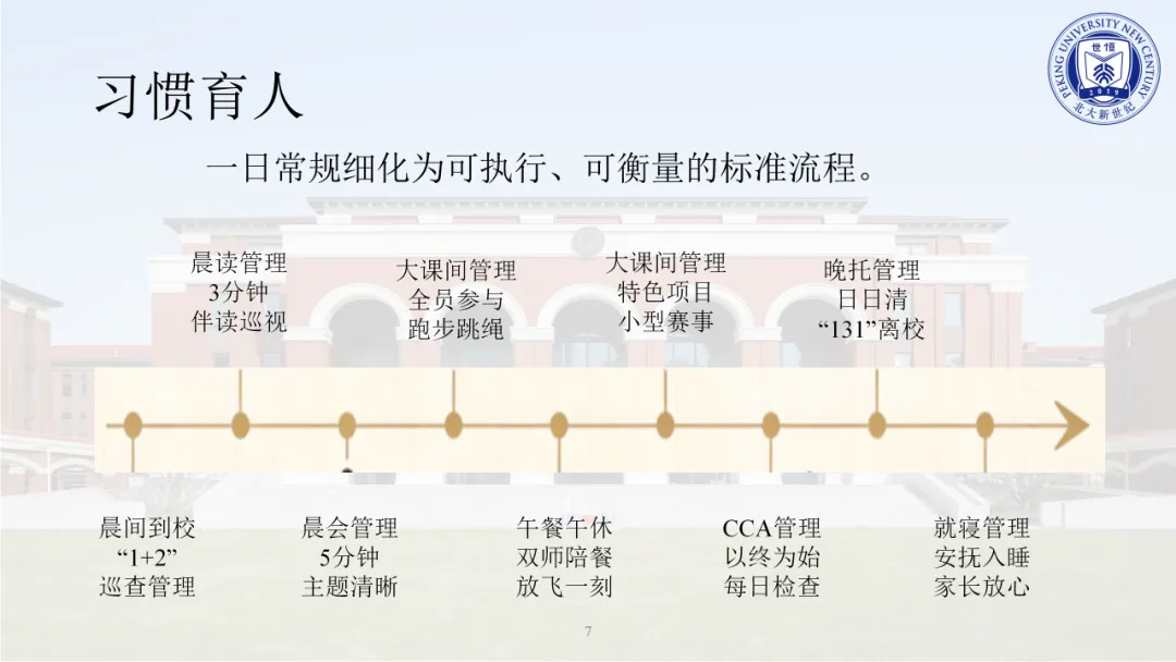 “教育的根本任务是立德树人。良好的习惯是高效学习的前提,温馨的环境氛围能潜移默化地滋养心灵,而富有内涵的特色活动,则能深深触动灵魂。为此,小学部将一日常规细化为可执行、可衡量的标准流程,例如,‘1+2’晨间管理模式,‘131’晚托放学机制等。”