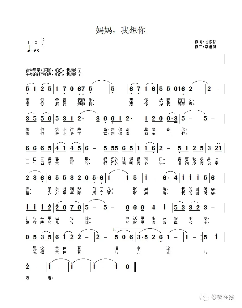 由刘俊韬作词,常连祥作曲,李 豪演唱的亲情歌曲《妈妈,我想你》,歌词简洁明快,字字发自肺腑;旋律婉转悠扬,句句扣人心弦;演唱高亢深情,声声催人泪下,抒发了游子思念母亲的真挚情感。