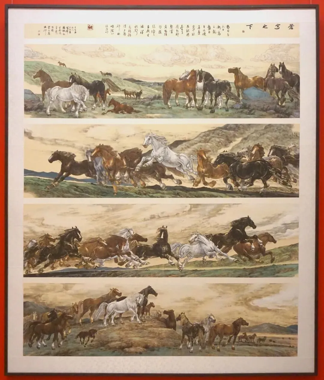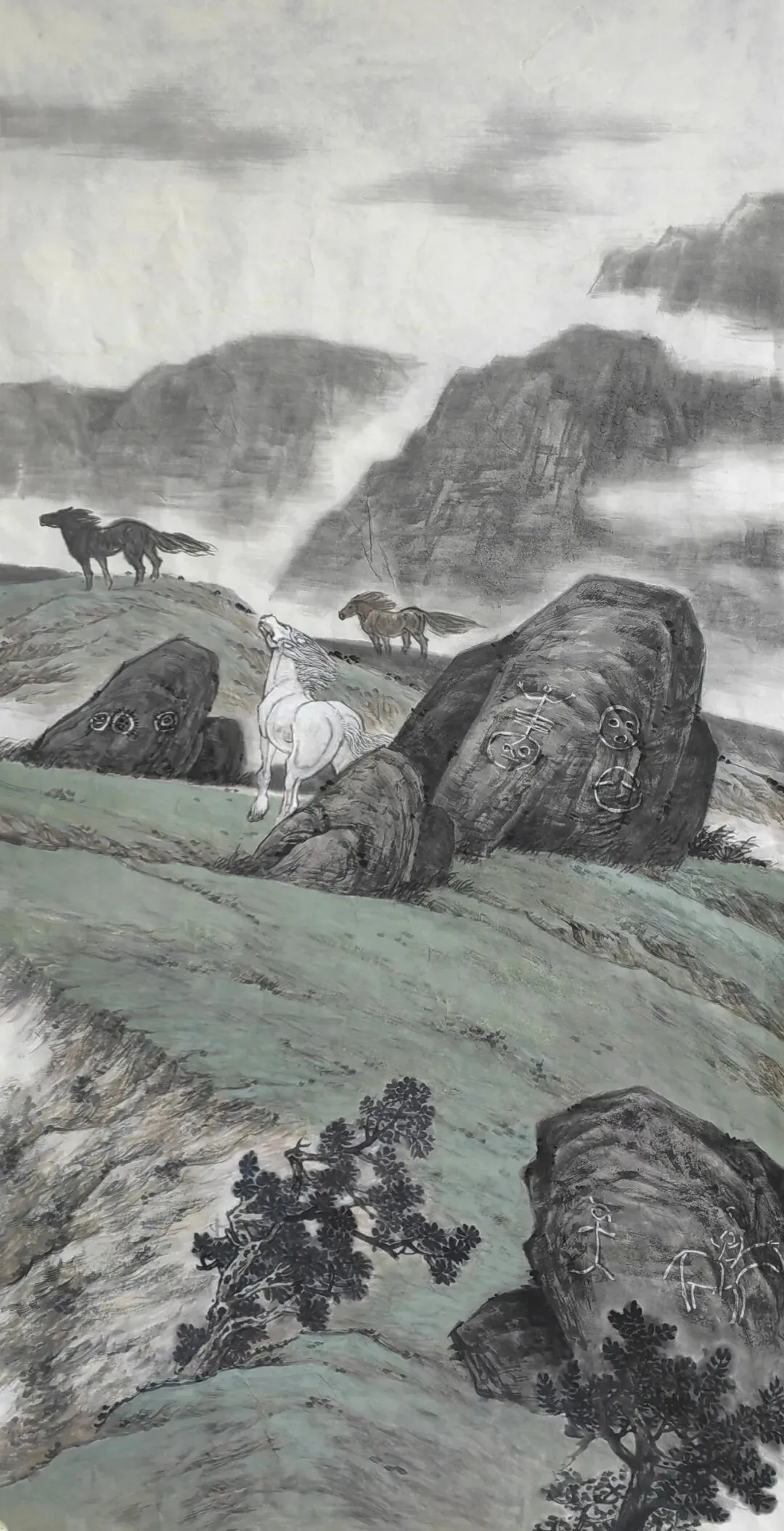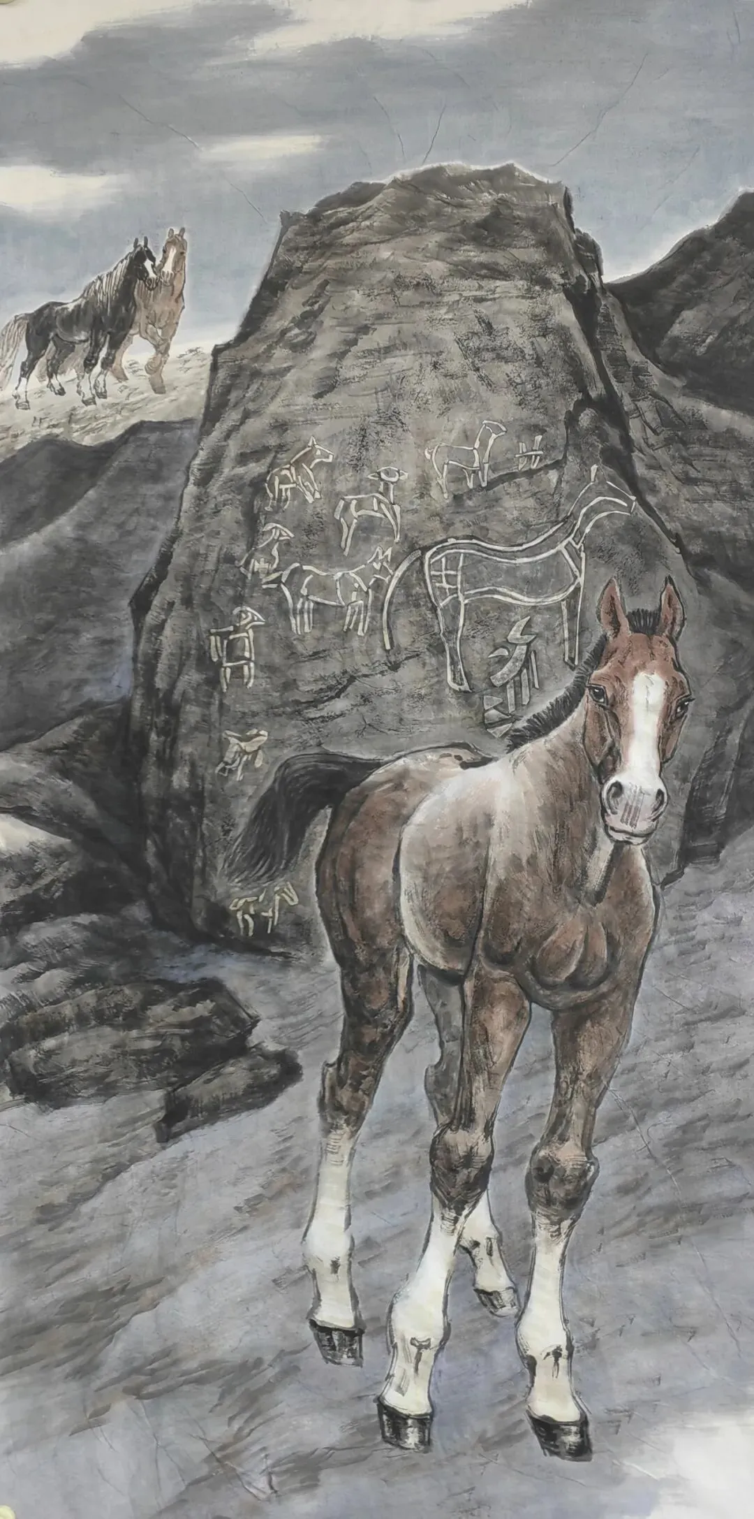 在“岁月如歌”组画中,或三两匹骏马依偎于岩画旁,或驰骋于阴山腹地,岩画的远古符号与鲜活的骏马形象交织,古今文脉遥遥相契,让尘封的历史有了生命的温度,让笔墨写意有了文化的深度。