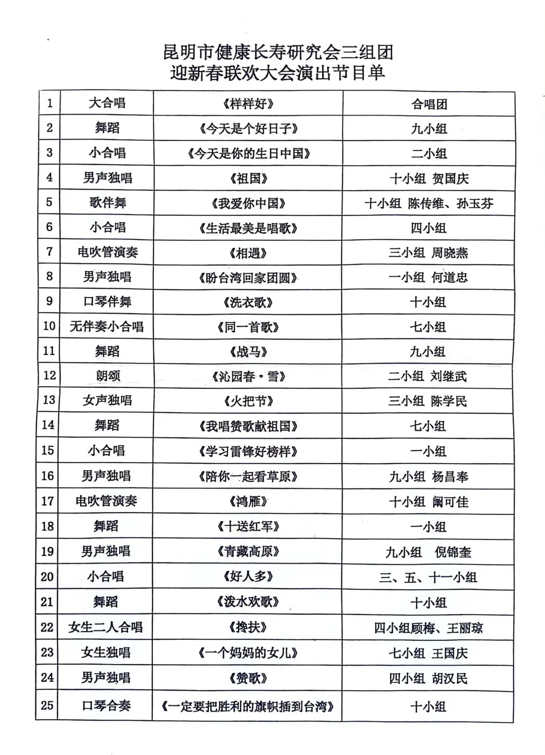 异彩纷呈的文艺联欢会开始了,一曲热情洋溢的,带着满满的云南人民特有的真诚、质朴风味的《样样好》全场大合唱,歌声嘹亮,为后面的演出开了个好头,所以接下来的各小组的节目都非常精彩,内容形式应有尽有,丰富多彩,有小组合唱,个人独唱,集体舞,独舞,朗诵,乐器独奏,口琴合奏,等近30个节目。最后,大会在宏亮的《歌唱祖国》的大合唱声中圆满结束了。