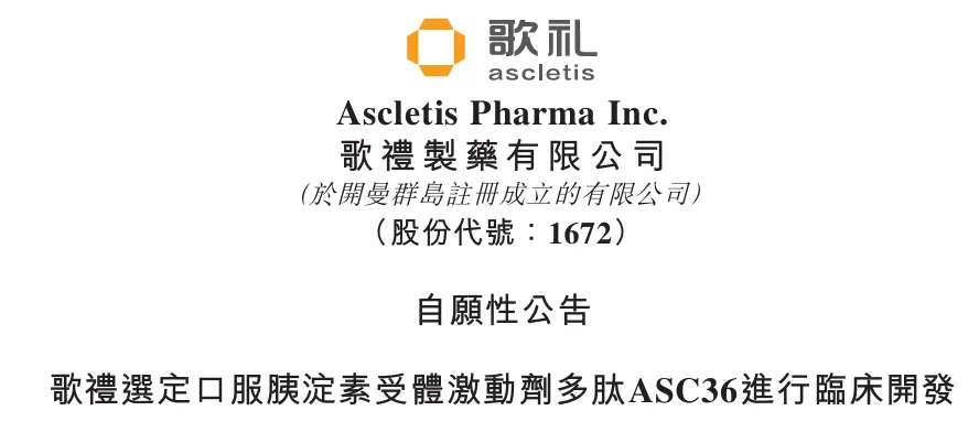 歌礼制药公司董事会宣布已选定其首款口服胰淀素受体激动剂多肽ASC36口服片进行临床开发。歌礼预计将于2026年第二季度向美国食品药品监督管理局递交ASC36口服片治疗肥胖症的新药临床试验申请。ASC36口服片由歌礼利用其专有的口服多肽递送增强技术开发而成。在非人灵长类动物中,10毫克ASC36口服片在每只动物中每日一次给药,给药7天后,稳态下的绝对口服生物利用度为8%,消除半衰期达116小时;25毫克ASC36口服片在每只动物中每日一1次给药,给药7天后,稳态下的绝对口服生物利用度为6%,消除半衰期达167小时。ASC36口服片较长的消除半衰期,为每日一次及更低频率的口服给药方案提供了支持。