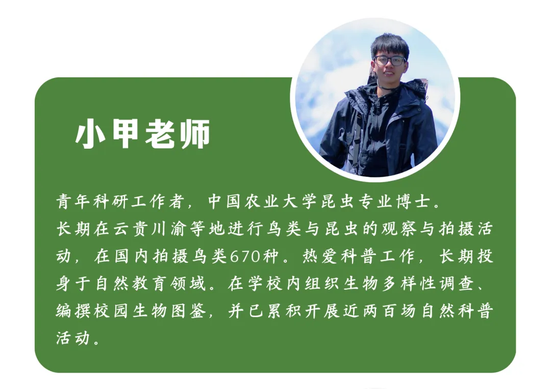 服务团队:全程一位自然观察导师,一位活动领队,根据活动内容邀请若干位在地指导老师(护林员和观鸟向导)。活动组织方会根据参加人数和指导老师的时间,灵活安排团队服务人员。