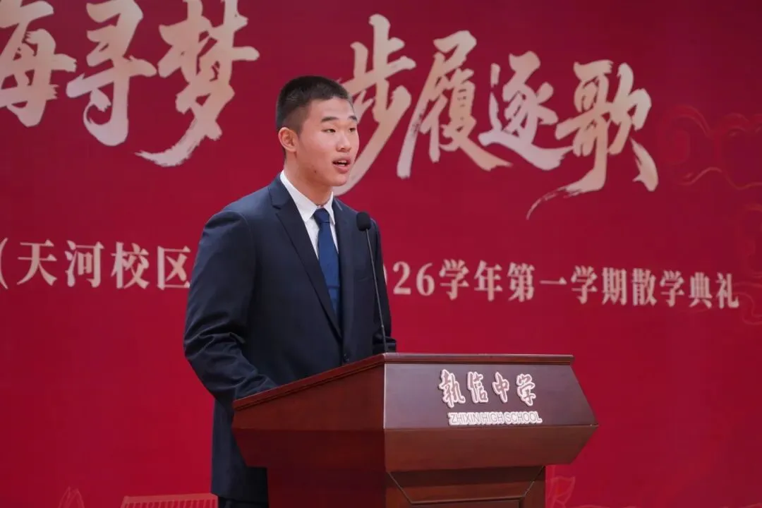 2025届校友朱赫(现就读于中国科学技术大学)在天河校区发言。他以“细化、量化、规范化”的学习思维为例,分享如何通过系统分析实现成绩突破。他感恩师友与家人的陪伴,强调信念与同行力量对跨越山海的重要支撑。寄语同学们以科学方法解难题,以温暖之心待征程,在寻梦路上步履坚定、且行且歌。