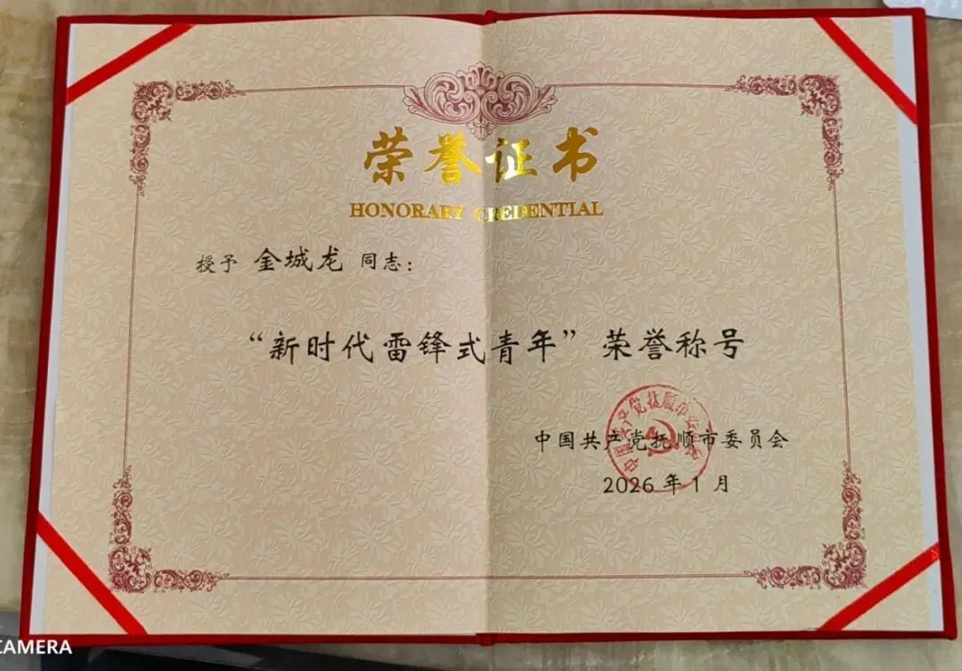 ▲中共抚顺市委员会授予金城龙“新时代雷锋式青年”荣誉称号