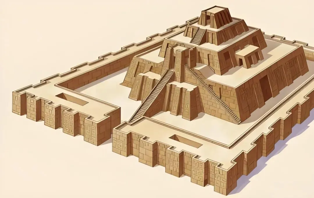 乌尔城的大庙塔复原图。乌尔第三王朝王室的居住地,建筑耸立在围墙中央,最中间塔高达15米,整座建筑用砖木搭建,非常坚固,千年屹立不倒。