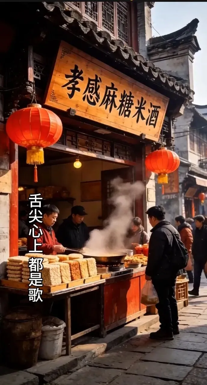 主歌2则将视角从千年传说拉回人间烟火,聚焦孝感最具辨识度的味觉符号——麻糖。“澴水清澈,八埠口烟波;糯米碾霜,芝麻撒满金锅”,澴水是孝感的母亲河,八埠口是孝感麻糖的发源地,一汪清水、一缕烟波,勾勒出孝感水乡的灵秀;糯米如霜、芝麻似金,精准描绘出麻糖原料的纯粹与制作场景的质朴。“老灶熬糖,香透街巷院落;一口酥脆,岁月甜在心窝”,没有华丽的辞藻,却用“老灶”“街巷”“酥脆”等极具生活气息的词汇,唤醒人们对传统美食的记忆。老灶熬煮的不仅是糖浆,更是时光的沉淀;入口酥脆的不仅是麻糖,更是乡愁的滋味。这一段歌词,将非遗美食的匠心、市井生活的温情与游子心中的乡愁完美融合,让孝文化从历史典籍中走出来,化作舌尖上的甜蜜、心底里的温暖。