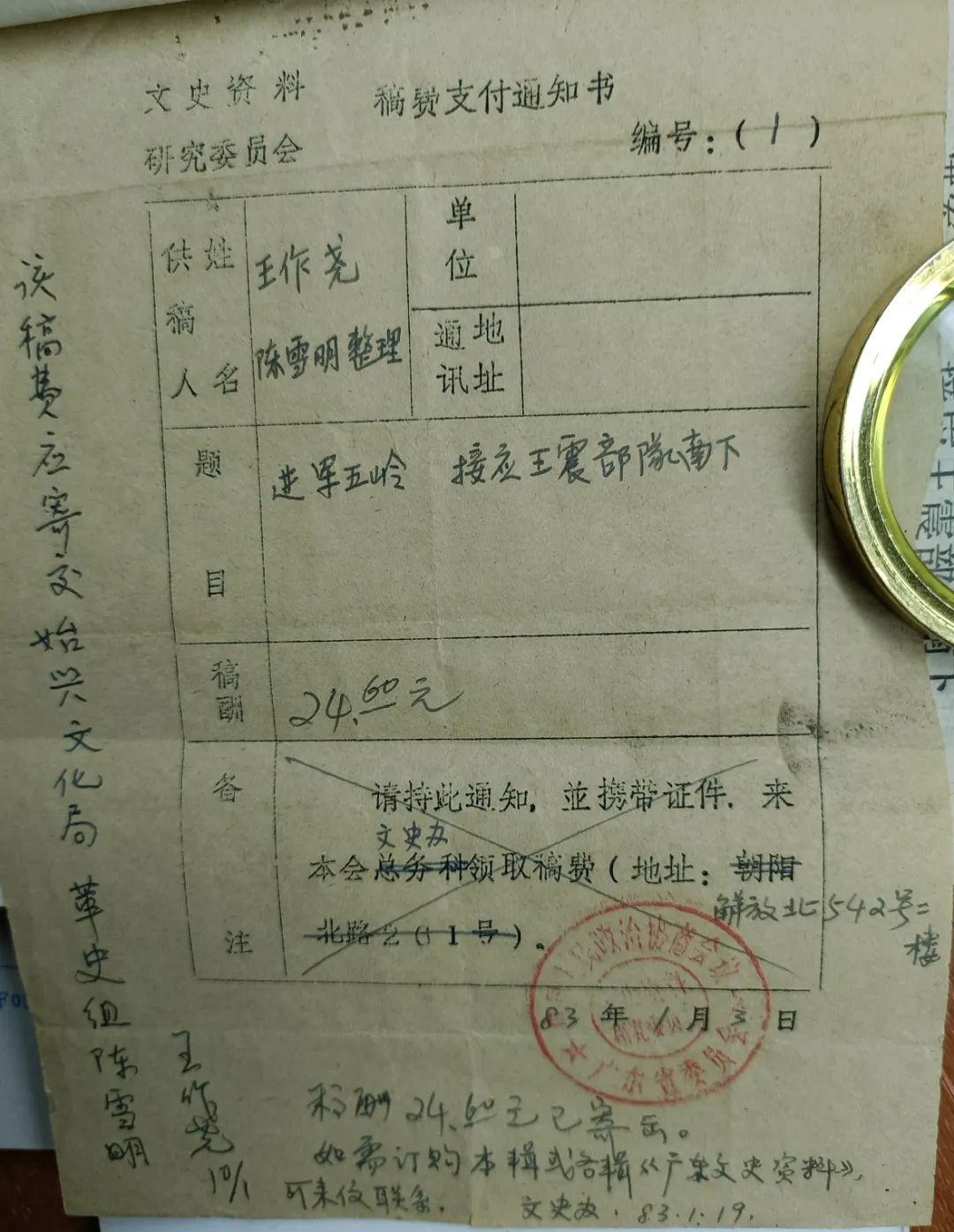 由于工作关系我采访过的领导有王作尧,吴伯仲、温盛湘、陈培兴、吴新民等等,在那些领导面前自知自己身份的低微和年幼无知,说话常以“请示”的口吻,作为一个始兴人,“白话”又不“白”,普通话也不太标准,他们那些东江纵队的人,都用白话来叙说,我必须打起十二分精神倾听,那阵子我的白话水平都提高了不少,有不甚解的语句,事后要请教讲广州话的人释疑。因为“大领导”的话,原则性很强,不敢贸然处之。不过我也很幸运,在《广东文史资料》第三十六辑(1982年广东人民出版社出版的)王作尧的“进军五岭,接应王震部队南下”一文中没有失误,被选为该辑的首篇,该篇篇目下我署名王作尧,我不敢用“王作尧”口述,陈雪明记录整理,我只在篇末署名陈雪明记录整理,所以这稿酬便寄给了王作尧(时为广东省人大副主任?),后王批转给我,现影印在案。