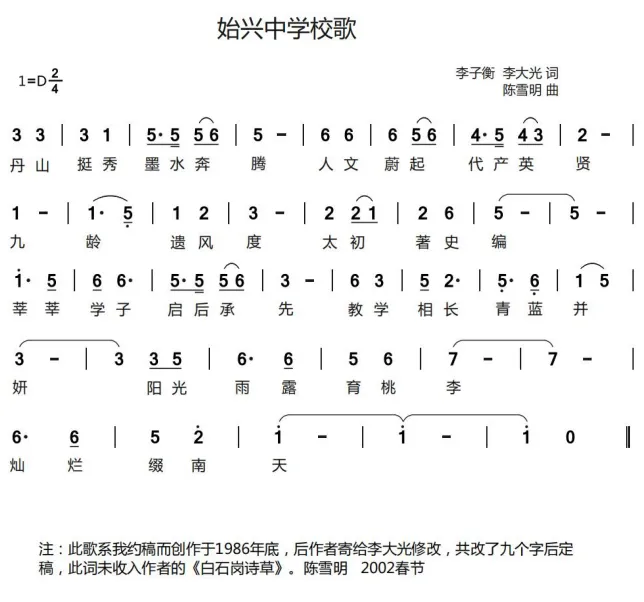 此外还有李子衡、陈方畴、陈爱庭、谢彦权等长辈也对我栽培有加,李老师对我说古体诗词的平仄韵律,还与我的次子春和“斗”成语。当他的《白石岗诗抄》出版前,用复写纸手写本时便送我一本,以后成书出版后又送了一本,还送了我几幅字,并详细解读。我最喜欢叙说一起编《始兴革命历史资料》时的那幅字:“不计文章拙与工,一同挥笔写英雄;墨江南北山头血,染得河山一遍红。”我很赞成这首七绝,我曾多次对我犬子说:律、绝古体诗,很讲究“起、承、转、合”尤其是转。李老师这首诗,要是我来写,写了前两句便写不下去,好像故事已经讲完了。殊不知李老师一转,墨江南北山头血,染得河山一遍红。真是妙不可言,有百尺竿头更进一步的感觉,真是,诗人就是诗人,至少我,佩服得“五体投地”!当年我也曾开玩笑的对李老说,您写一首始兴中学校歌的词,我来谱曲试试,结果李老写好后,还寄给李大光老先生修改了九个字后寄回,事后很久才谱好曲,未能赶上给两位老人家过目,今天才公诸于世。