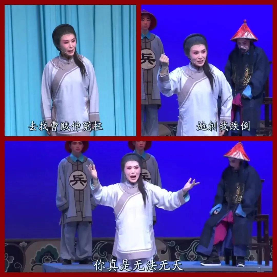 唱段10:“闻听凶信吓的我魂飞飘荡,她夫妻悲声声我也感伤。”前句,“荡”字虚化如烟;用高音弱唱,声音虚浮战栗,形神俱散。后句,“伤”字带气声,共情。“这塌天大祸本是我闯,却连累少爷遭祸殃。”前句,“闯”字下沉,自责;声音转实转沉,是理性的自我归罪与担当。后句,“殃”字轻吐,愧疚。“再说凶器不全怎定案?”“案”字上扬,质疑司法,是下句的前奏。 “我要自首到法场,去找曹贼申冤枉。”节奏加快,力度加强。前句陡然坚定,声线如钢而不炸,赴死之勇内化为沉静;后句,尾音上扬,充满决绝。“自首”与“申冤”这一矛盾行为在演唱中被统一于义无反顾的决绝之中,“申冤枉”三字以“大口”式的重音收束,但整体气息不乱,“含着”义无反顾的冷静决断,标志着她从幕后走向前台,从暗斗转向明战的最终抉择。