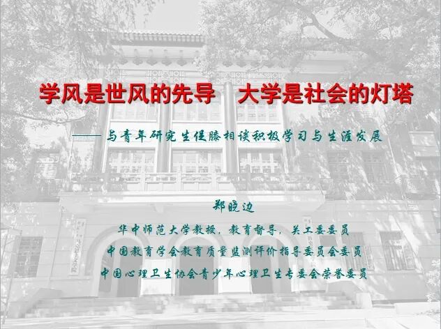 为了帮助同学们更好的认识自我、规划自我和完善自我,疏解疫情期间学习的迷茫和焦虑的情绪,以积极健康的心态面对学习和生活,我院特邀请郑晓边教授莅临学院,作了“学风是世风的先导,大学是社会的灯塔——与青年研究生促膝相谈积极学习与生涯发展”的讲座。历史文化学院党委纪红书记、辅导员陈勇、史亚楠等老师以及我院广大本科生、硕博研究生参加了本次讲座。 “学风是世风的先导,大学是社会的灯塔”,是出自老校长、著名历史学家章开沅先生的一句话,社会灯塔能够照亮人类的幸福之路,大学象牙塔也应成为师生与民众的思想之光。郑教授在怀念章开沅先生的同时,向大家阐释了本次讲座主题的来源和含义。郑教授从人的身心结构、心理资本、人的生涯发展等方面分析了积极心理的重要性。 他强调,广大研究生未来要成为教师,不仅要懂教育,也要懂心理。未来教师的心理是不断成长的,要做一名成熟的教师,一名有幸福力的教师,就要认真进行生涯规划,了解自己的性格和教师职业的要求,促进心理健康。当前抗疫背景下,同学们一定要学习心理自助,积极参与控制传染源、切断传播途径,增进身心抵抗力的活动,学会情绪管理,学习人际沟通,会读书,读好书。讲座最后,郑晓边教授对同学们寄语:学有法则灵,情有诉则乐,行有志则远,心有望则福。在师生互动环节,郑晓边教授对同学们提出的各种学习、生活、心理方面的困惑一一作以解答。同学们纷纷表示,自己在郑晓边教授的指导中受益匪浅。