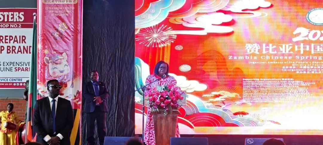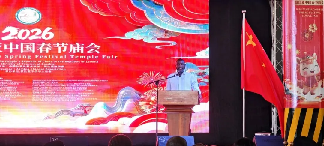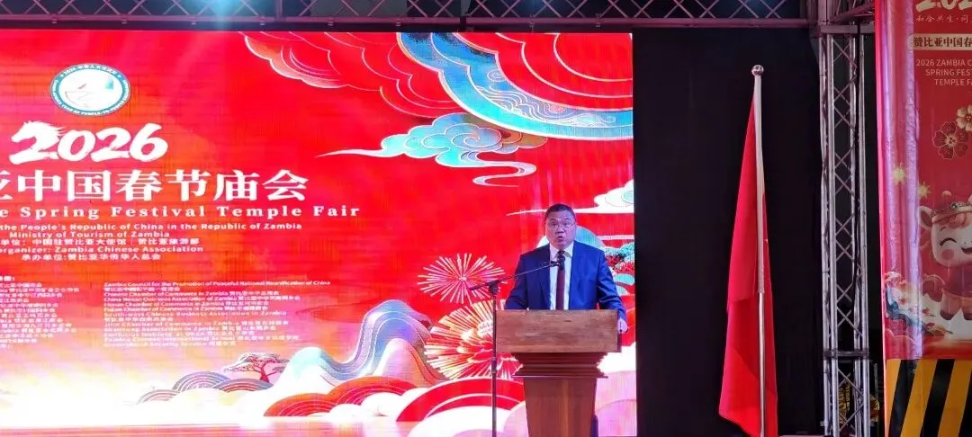 2026年2月8日,“2026赞比亚中国春节庙会”在卢萨卡莱维广场隆重举行。活动由中国驻赞比亚使馆与赞比亚旅游部共同主办。赞比亚副总统纳卢曼戈、中国驻赞比亚使馆临时代办王晟,以及各国驻赞使节、在赞中资机构、侨社和企业代表出席了活动,近千名两国民众齐聚一堂,共迎中国农历新春。