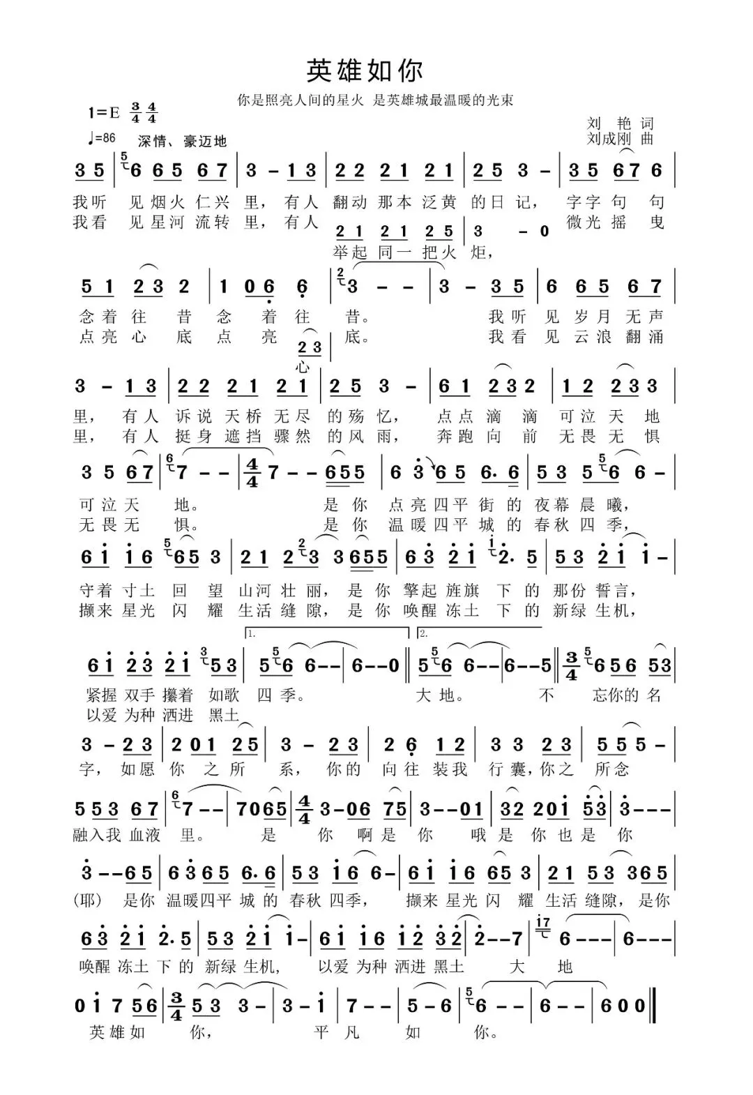 歌曲 《英雄如你》全文304字。以“我听见——我看见——不忘你的名字”为核心脉络,通过三次时空对话串联历史、当下与未来,深情诠释英雄精神的时代内涵:既致敬革命先烈,也赞美每一位在平凡岗位上默默奉献的普通人。
