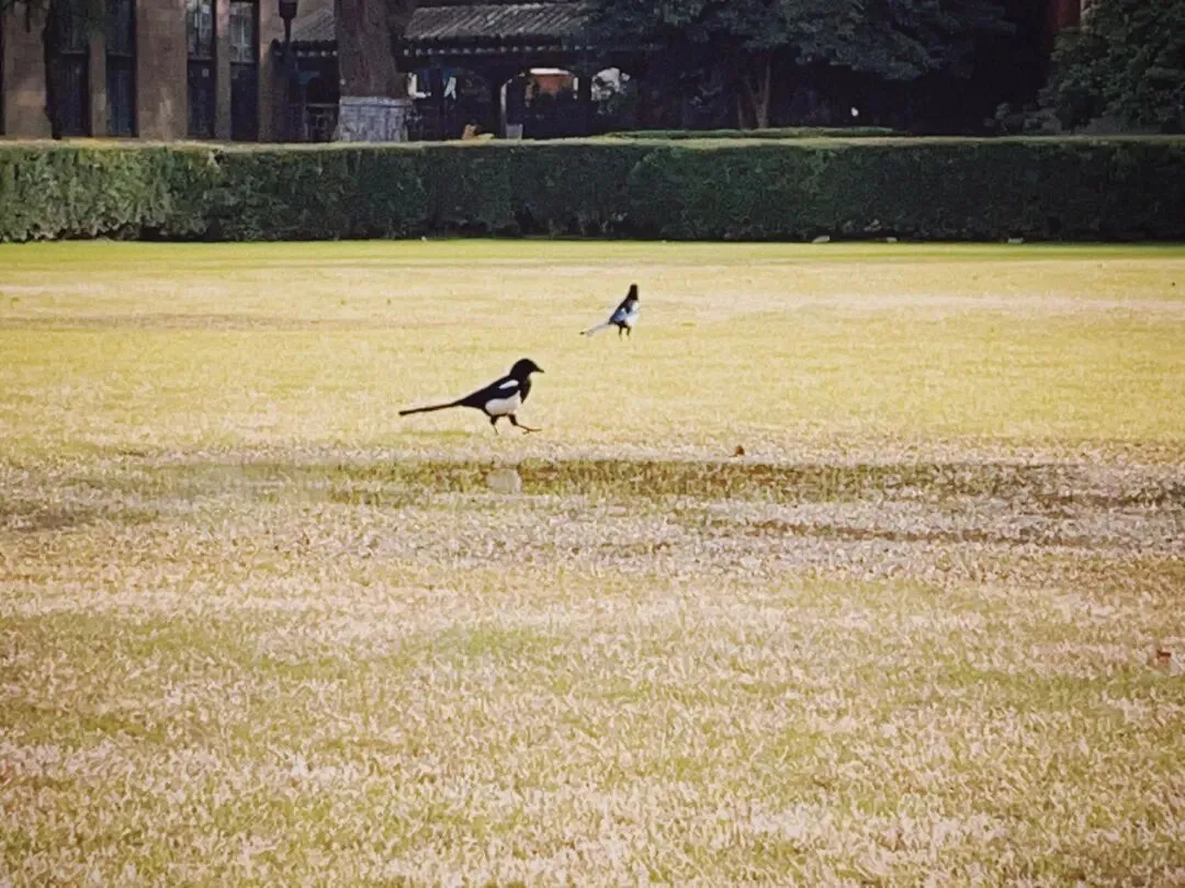 但奇妙的组合总会带来奇妙的效应,比如现在我坐在草坪上无所事事地晒太阳,似乎已经该被称为寒风的秋风带着不管不顾的气势往我的毛衣缝隙里钻,背后是一棵我见过最盛大的银杏,金枝如仙人之手静静垂落。四下寂静,鸟鸣声里仍然是珠颈斑鸠的标志性叫声最明显。草坪的中央有一片浅薄的水坑,两只巨大的黑白色喜鹊像走地鸡一样在周围巡逻、啄饮,一群浅色的我不认识的小型鸟像两位的追随者一样散布。