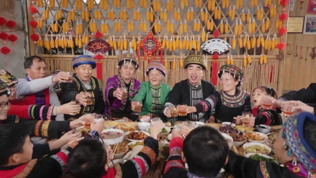 每逢佳节,广西南宁上林县镇圩瑶族乡的蓝连青家里总是热闹非凡。瑶族、壮族、汉族美食齐齐上桌,四代同堂围坐一团,欢声笑语中流淌着三族共居的温馨与和谐。
