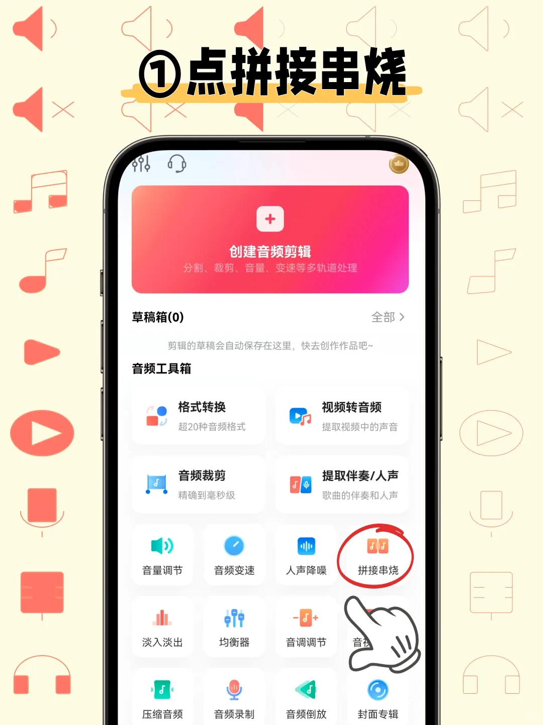 1️⃣打开音频 快剪 ,在主页面找到我们需要使用的功能“拼接串烧”,有很多功能可以哦;