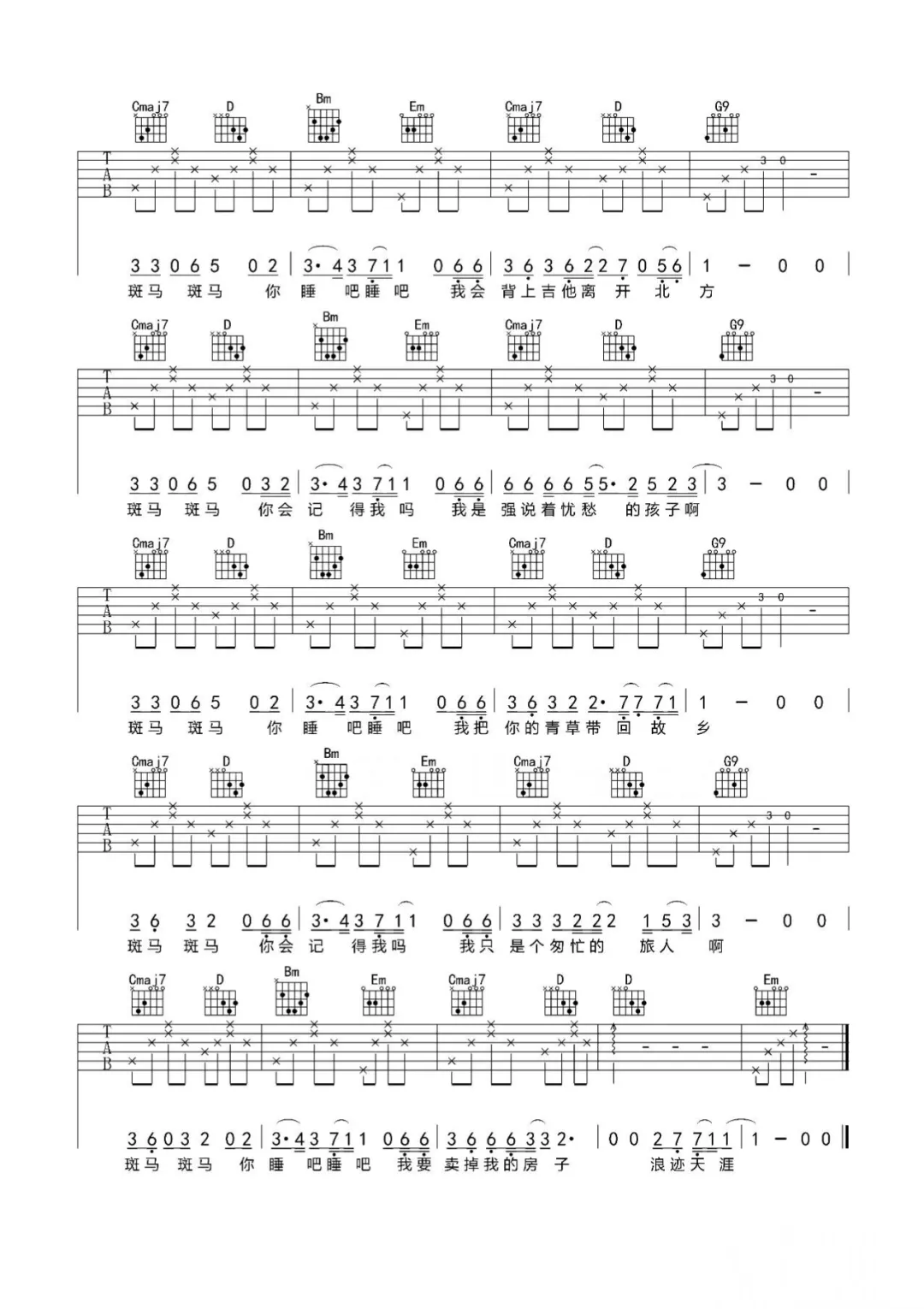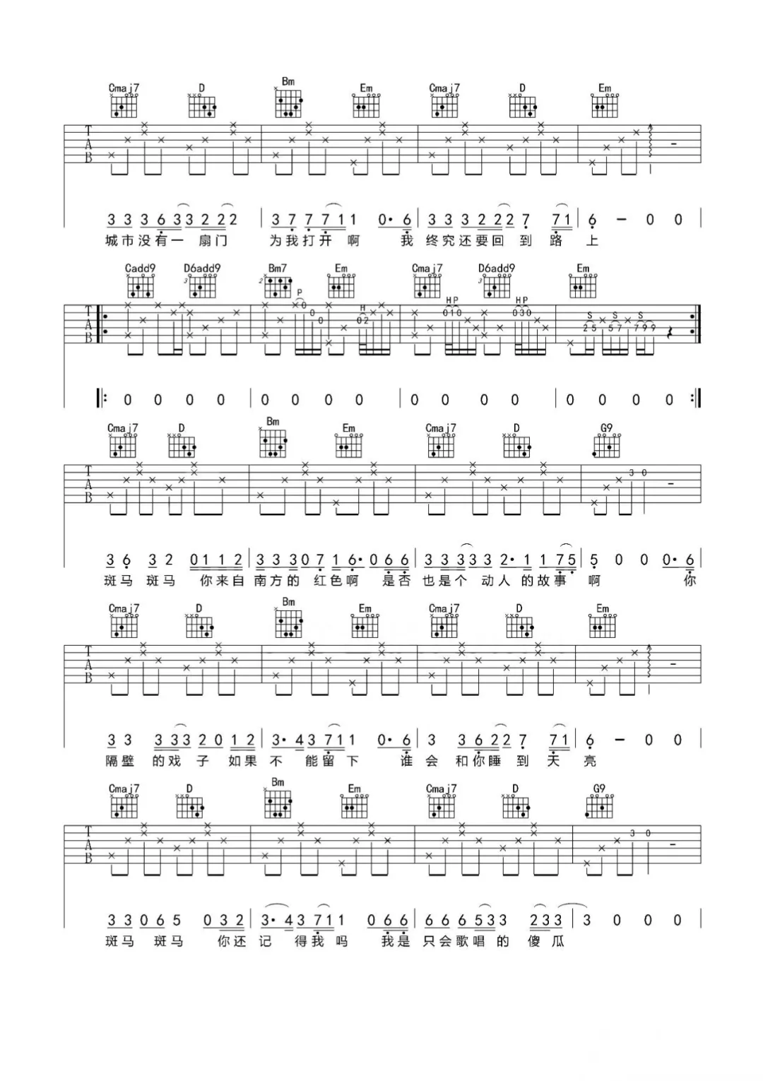 宋冬野的《斑马斑马》以其独特的曲风和深情的歌词,赢得了众多听众的喜爱。这首歌的吉他伴奏部分既简单又富有感染力,适合初学者在练习过程中逐渐掌握吉他弹唱的技巧。通过弹唱这首歌,你可以感受到吉他音乐与歌词之间的紧密联系,进一步提升自己的音乐表现能力。
