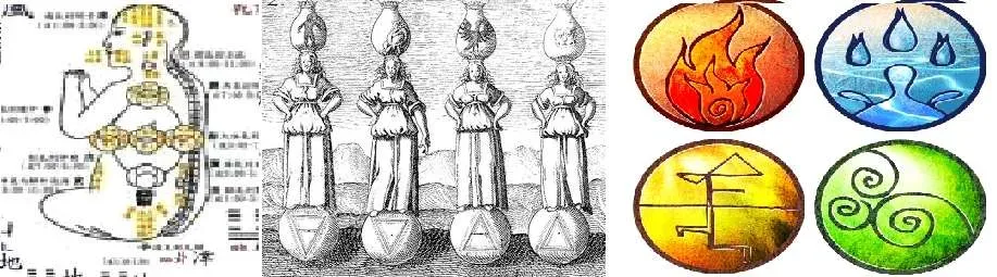 在中华叫金木水火和合成土,在西方叫四大元素化合成金,在印度叫四大合成空。