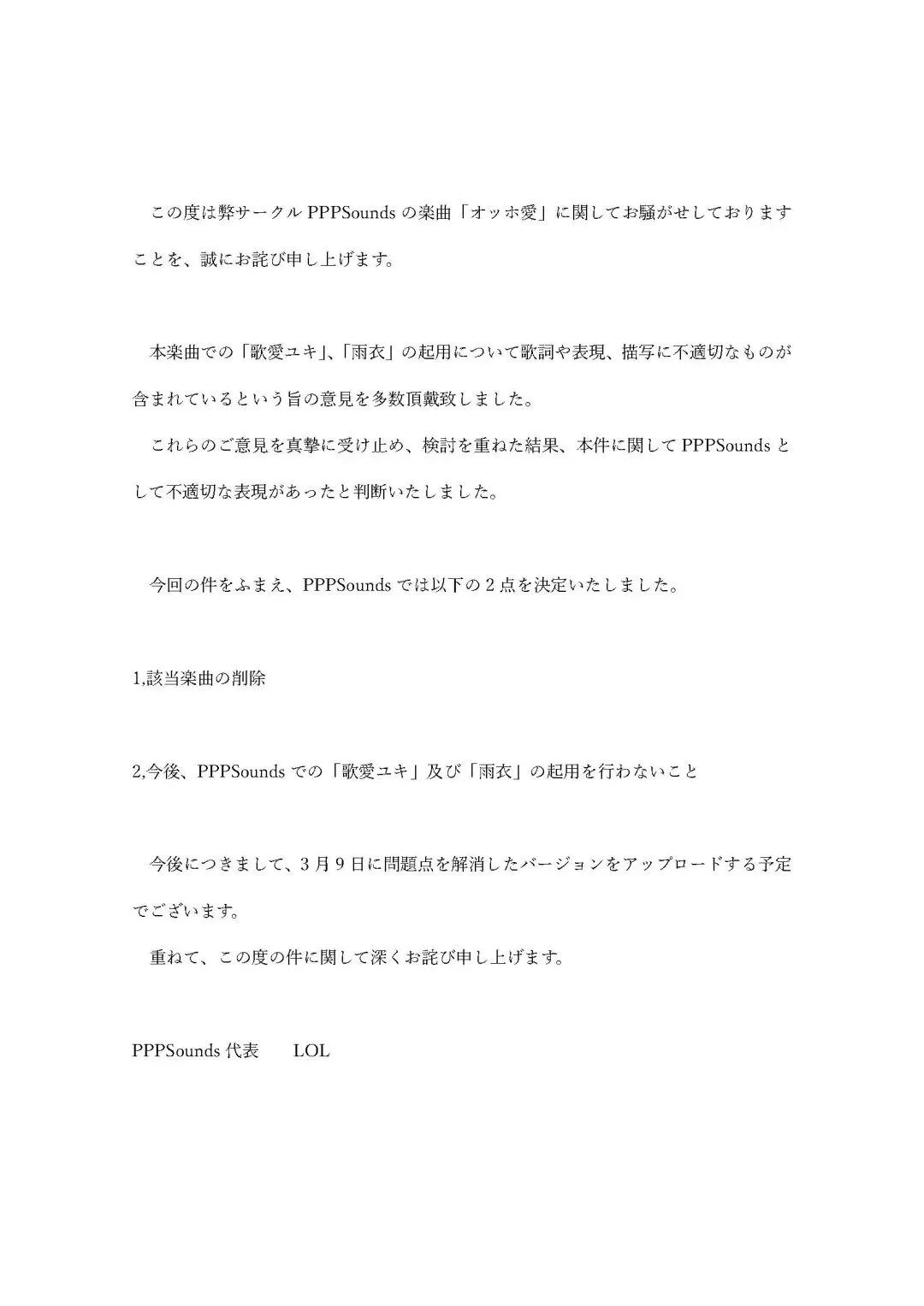 “关于此次弊社PPPSounds的乐曲《哦齁爱》引发的风波,我们深表歉意。本乐曲中,因使用了「歌爱雪」和「雨衣」,其歌词、表现及描写被大量指出包含不恰当的内容。我们真诚接受了这些意见,经过反复讨论,PPPSounds 判定本作品确实存在不恰当的表现。基于此次事件,PPPSounds 做出了以下两项决定:删除该乐曲,并且今后PPPSounds将不再使用「歌爱雪」及「雨衣」关于后续处理,我们计划于 3 月 9 日上传已解决问题的全新版本。再次就此次事件深表歉意。——PPPSounds负责人 LOL”