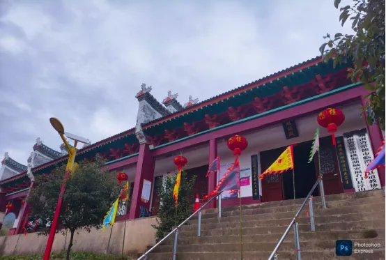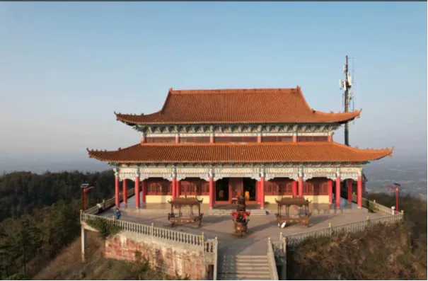 重檐歇山顶为典型的中式宗教建筑特征,且与道教宫观的常见形制高度吻合。橘红色筒瓦是道教建筑中的常用颜色,象征祥瑞与仙境的色彩。檐下清晰的彩绘斗拱和额枋是中式木构建筑的标志,道教宫观常通过繁复的彩绘(如云纹、仙鹤、八卦图案)体现道教符号。