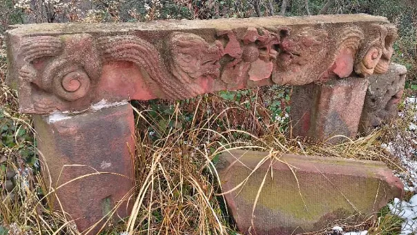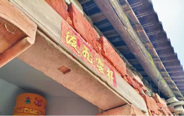 横楣雕刻螭龙(螭吻/蚣蝮)卷云纹、花卉纹,两侧有立柱,表彰功名或贞节,属高等级建筑装饰。螭吻是古代中国神话传说中的龙生九子中的第九子。自东汉起,道教继承了先秦时期乘龙升天、沟通天人的信仰传统,被尊为"三轿"之一。道教还提出"蛇化成龙"的理论,认为龙非自然生物而是由蛇感化而生。