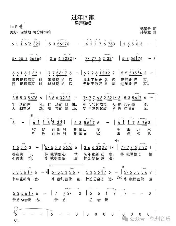 人这一辈子,总有求学、行伍、商旅、公务、务工等外地生活的经历,虽然可以把他乡作故乡,但更多的是客居异乡的感觉。词作者魏星云曾在异地的部队服役十年,青年作曲家孙敬龙,原籍新沂,在泰州求学并就职在当地,现为中国音乐著作权协会会员、江苏省音乐家协会会员,共同的生活阅历,才有了这首《过年回家》。