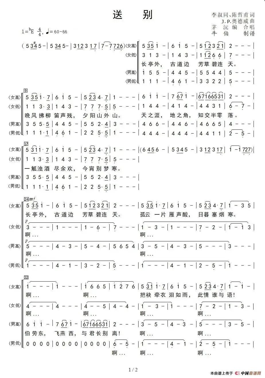 《送别》是由李叔同于1915年填词的歌曲,曲调取自约翰·庞德·奥特威作曲的美国歌曲《梦见家和母亲》。1936年,百代公司发行了北师附小学生龙珣独唱的灌录唱片 ,该版本后被中国唱片2004年出版的专辑《百年经典1:秋水伊人》收录 。