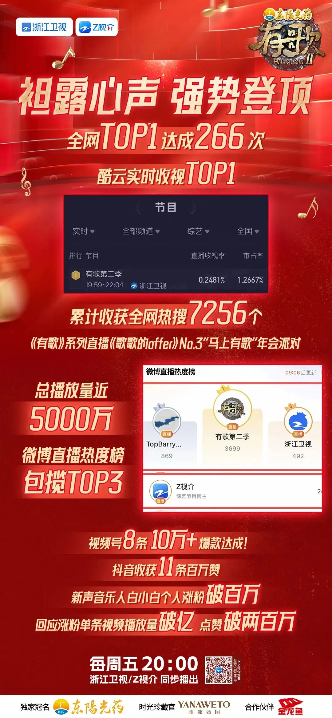 此外,本周五在节目录制期间,@浙江卫视、@Z视介、@有歌第二季 三大矩阵账号联动新华网及30余位嘉宾同步开启直播《歌歌的offer》“马上有歌”年会派对炒热全网,直播总播放量近5000万,直播微博热度包揽TOP3,掀起一轮又一轮讨论热潮。彩铃七子现场轮番演唱个人金曲、欢子与三个勤天趣味互动等画面令人直呼“80、90、00后的青春都在这里了!”