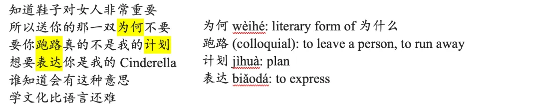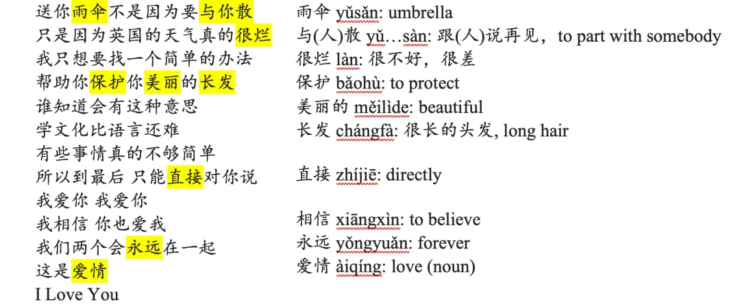 1、让学生观看这首歌的MV,同时学习歌词。MV的链接与老师准备的歌词预先发给学生。歌词里的标黄处是老师觉得学生可能还不知道的生词,所以在右侧标注了拼音和对应英文解释。为了让学生准确掌握歌词的发音和声调,我们没有将所有歌词标注拼音,而是另外准备了歌词的普通话朗读录音。这样才能“逼”学生一定要去看MV、听录音,用耳朵来学习。