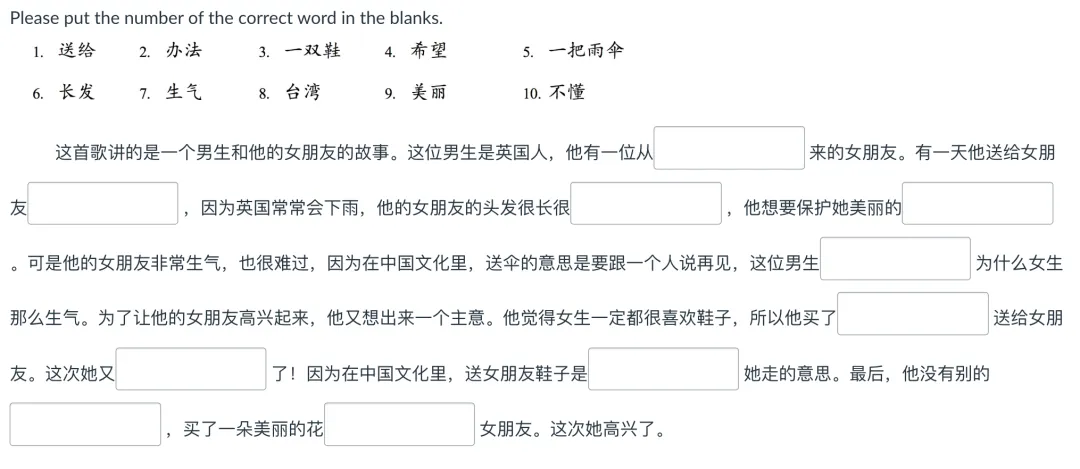 2、为确保学生理解了歌词,我们还准备了一个完形填空(cloze)练习。完形填空练习能够用较短的时间测试出学生的阅读理解和词汇语法运用能力,同时这个段落也是为了课上的问答活动和复述任务做一个预热和铺垫。如果要提高这个练习的难度,老师们也可以把前面的备选词语(word bank)拿掉,让学生直接填空。如果要降低这个练习的难度,每个空格可以提供两到三个选择项。总之老师应该按照自己学生的能力来设计预习功课。