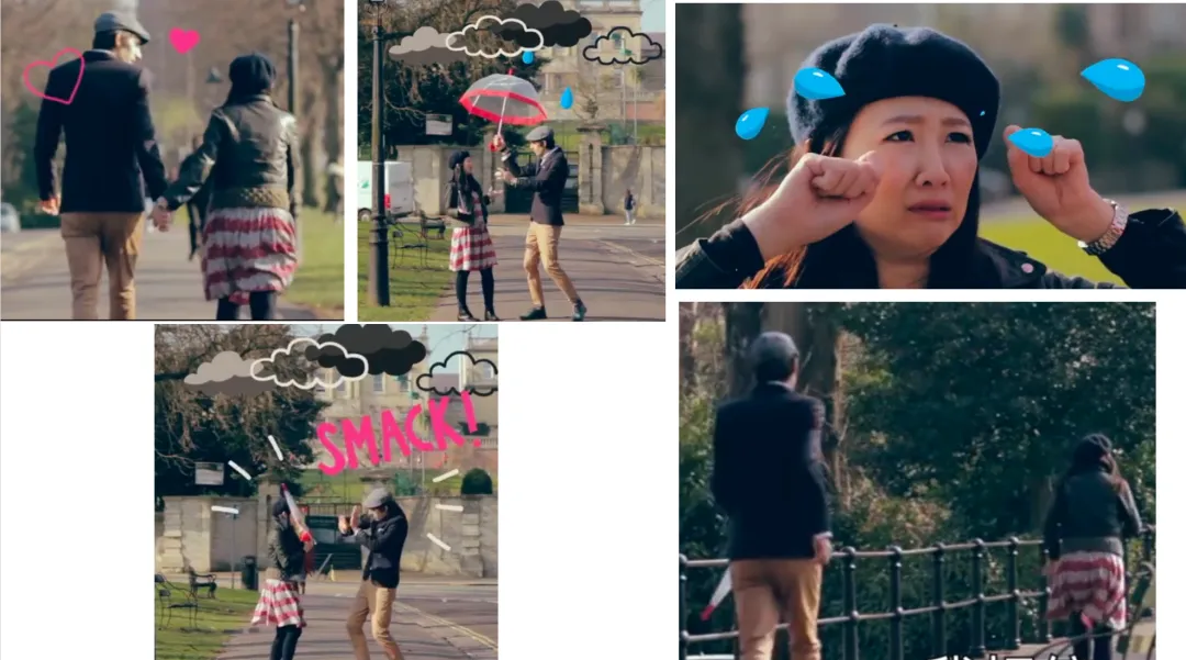 女生很生气,她做了什么?【女生很生气,她用伞/拿着伞打男生。】