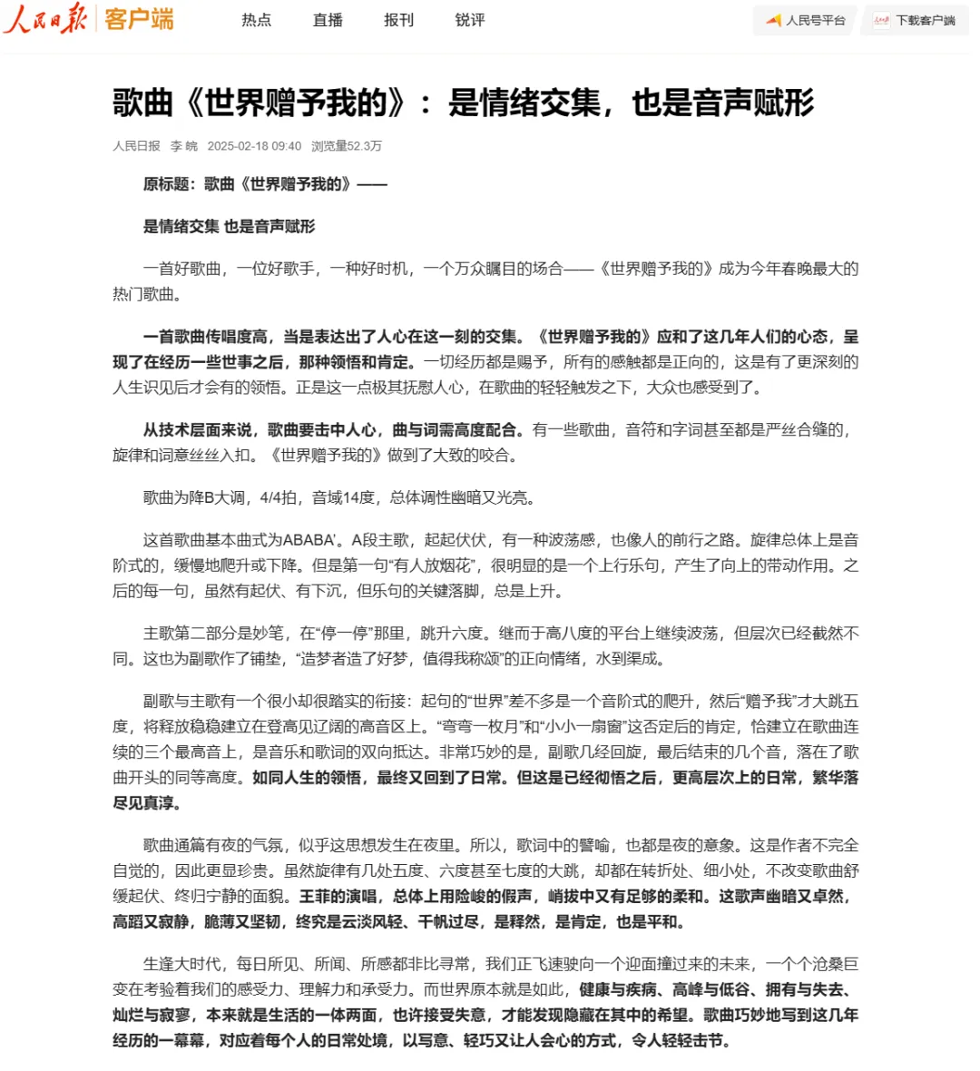 2025年2月18日,人民日报刊发了知名乐评人李皖写的一篇文章《歌曲<世界赠予我的>:是情绪交集,也是音声赋形》。文中写道:一首歌曲传唱度高,当是表达出了人心在这一刻的交集。《世界赠予我的》应和了这几年人们的心态,呈现了在经历一些世事之后,那种领悟和肯定。