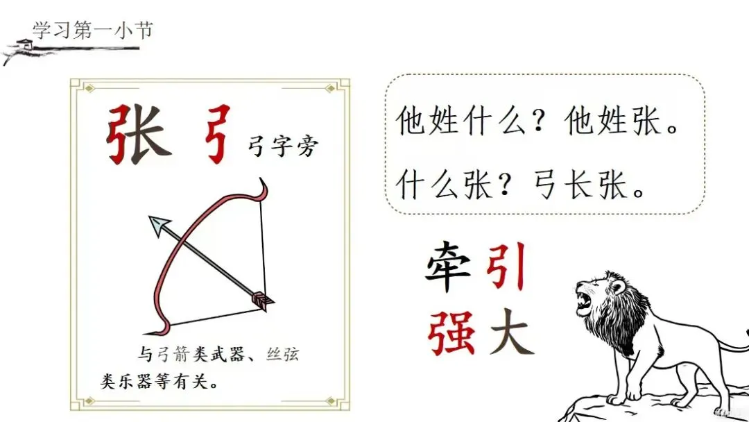师生互动:我们有三四个人,我想知道他姓什么,需要你告诉我。重点识字:弓字旁。结合图文理解:弓字旁表示有力、弯曲,形象好记。