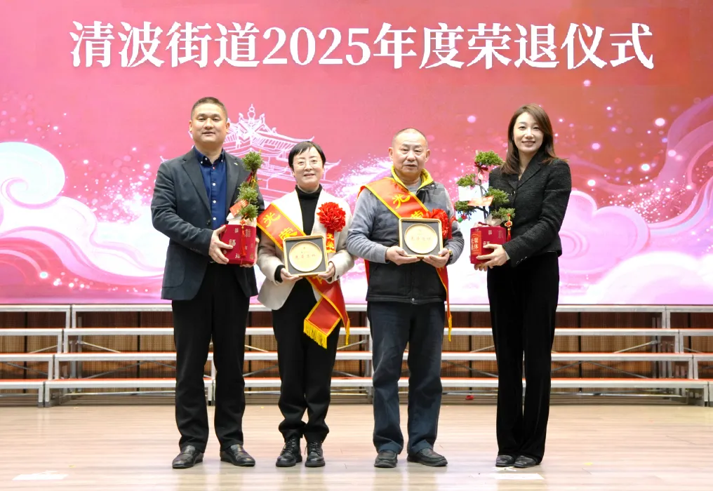 2月13日,街道举行荣退仪式。街道党工委书记张建文,党工委副书记、办事处主任高宇为两位退休干部代表送上纪念牌、常青树与荣休纪念册,致敬他们扎根清波、默默奉献的岁月。