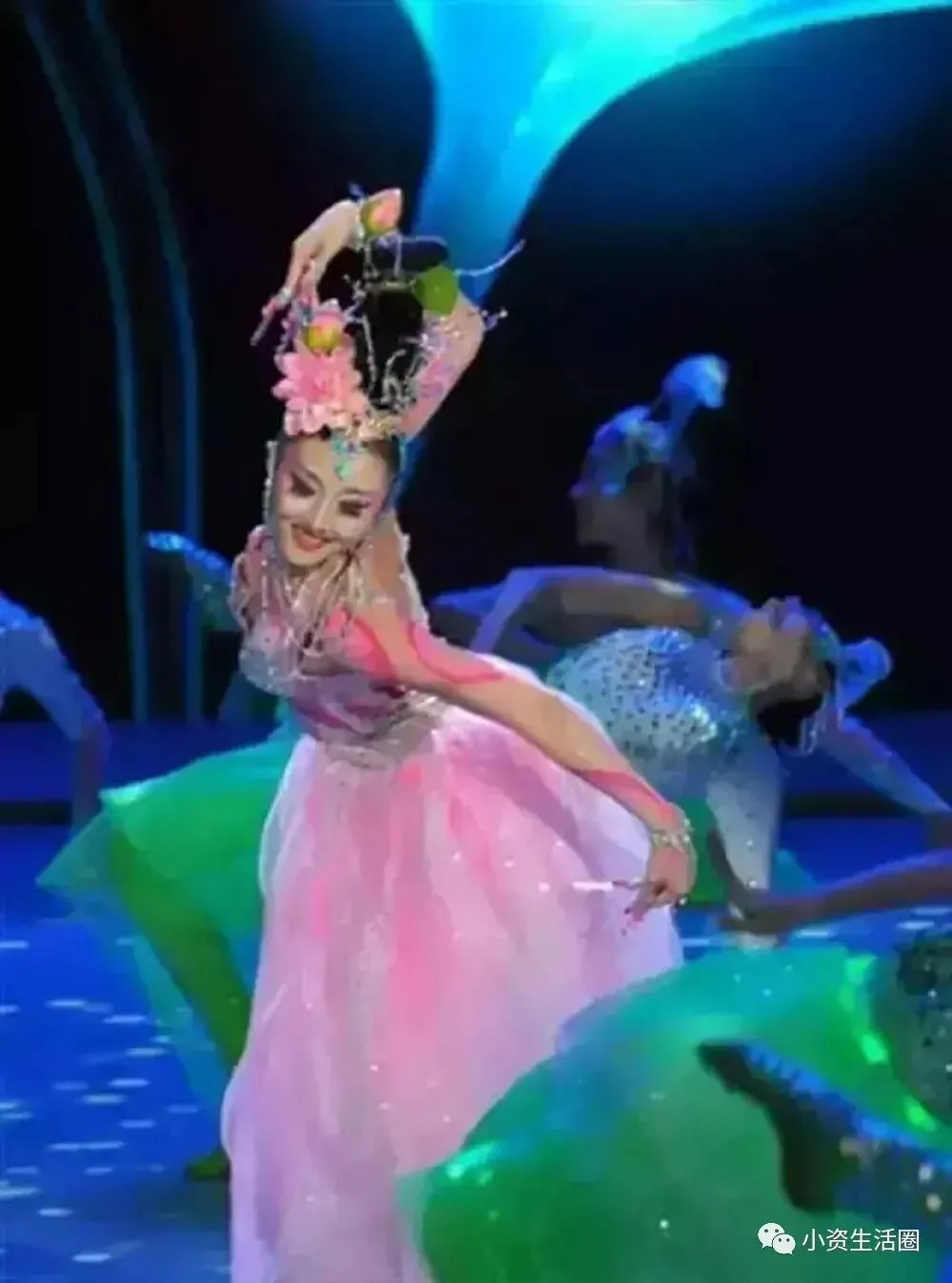 《荷塘莲语》中舞蹈演员们穿着萤光的衣服跳舞,背后的大萤幕上,随着歌曲变幻着。让人如痴如醉的荷花水塘美景,金色的莲花,在深蓝色的海水中绽放。