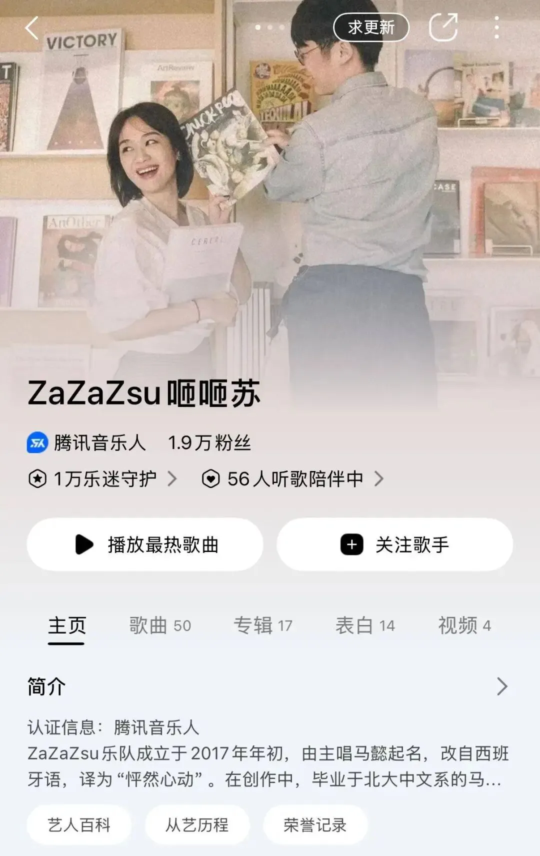 有意思的是,“ZaZaZsu咂咂苏”资料提到,这支乐队由来自北大的两位毕业生组成,乐队名称就是西班牙语的“怦然心动”。词作者及主唱是毕业于北大中文系的马懿,曲作者是毕业于北京大学信息与科学学院的程锦远。两人的作品里,恋人、浪漫、哲思是主打元素。