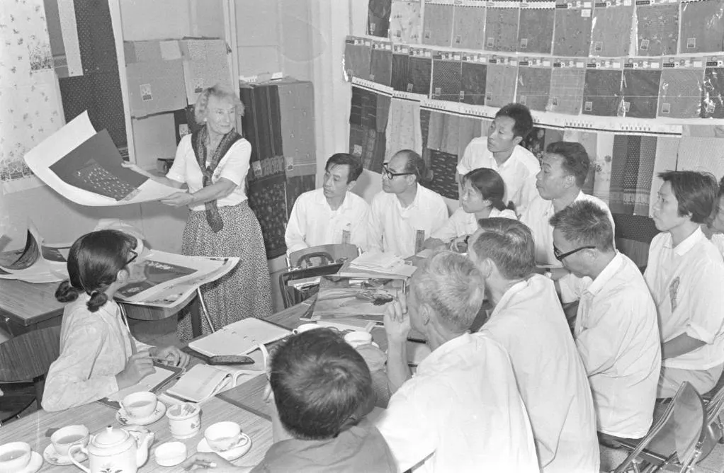 在1978年秋季广交会上,我纺织品交易团工作人员请西德客商介绍西德丝绸花色样品,以便使出口商品产销对路。图源新华网