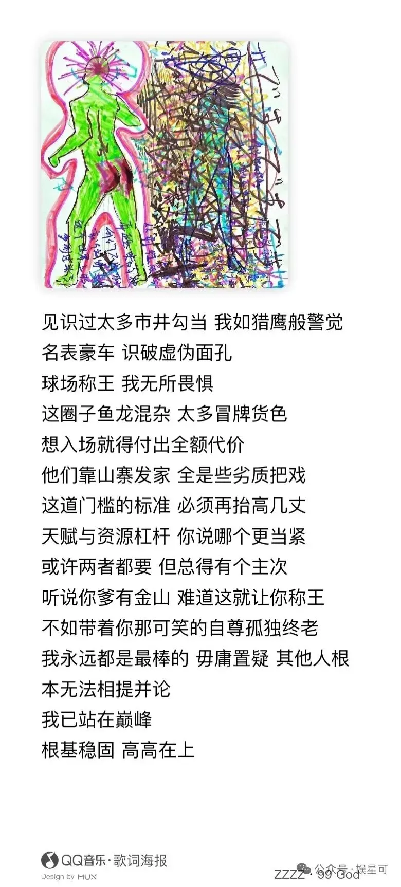 除了那句最出圈的“看不惯啊,忍着呗”,歌词里还毫不客气地写道: “这圈子鱼龙混杂太多冒牌货色”、“这道门槛的标准必须再抬高几丈”、“不如带着可笑的自尊孤独终老” 。