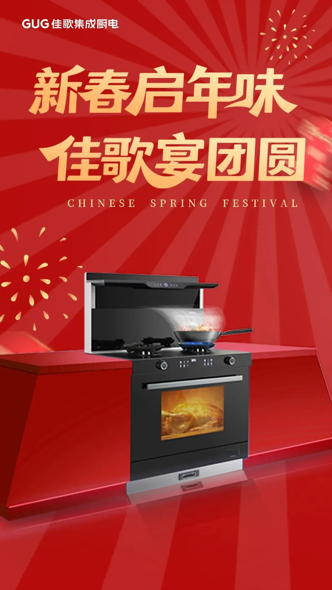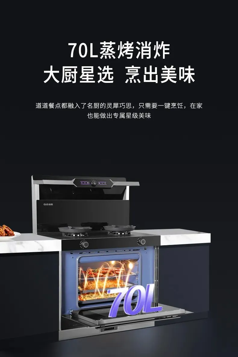 佳歌A5SZK蒸烤一体集成灶,70L蒸烤消炸一体腔,蒸烤炸消一步到位,一次搞定一桌硬菜,高效烹饪不丢味,分分钟端出热气腾腾的团圆宴。