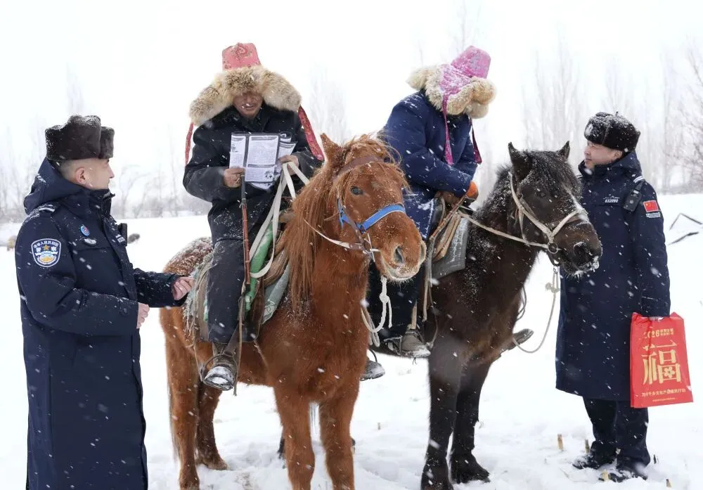 2月12日,新疆阿勒泰边境管理支队库尔木图边境派出所副所长塔斯肯·加纳提(右一)与民警叶尔兰·海吾热拉,冒雪深入牧区开展法治宣传工作,把法律知识送到牧民身边。