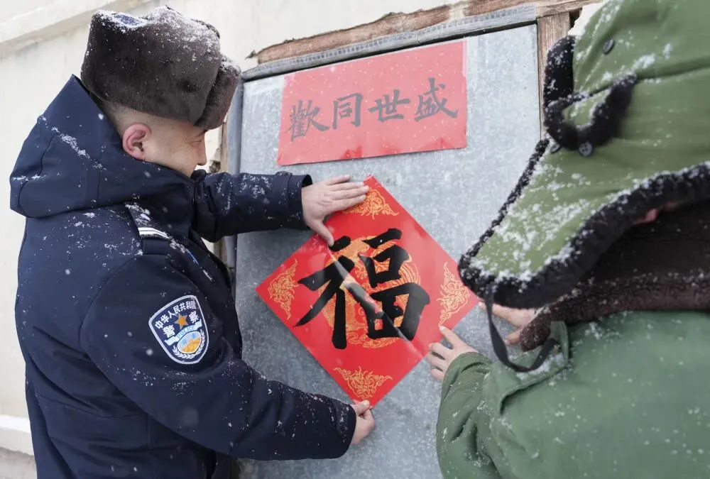 2月12日,新疆阿勒泰边境管理支队库尔木图边境派出所副所长塔斯肯·加纳提(左)为牧民家门贴上新春福字。