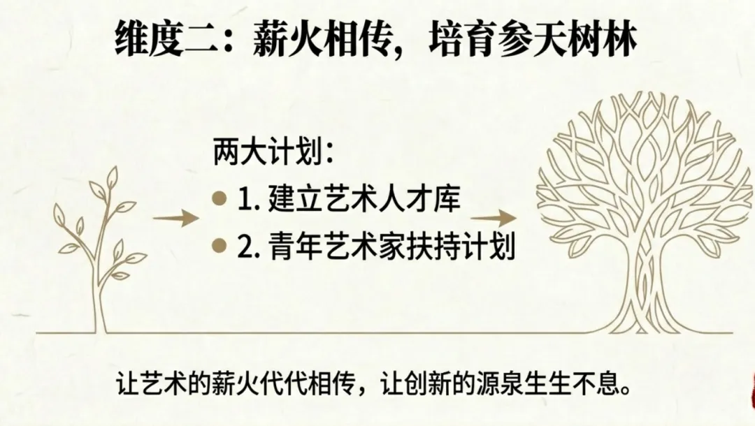 培育艺术的参天树林。建立健全艺术人才库,实施青年艺术家扶持计划,让艺术的薪火代代相传,让创新的源泉生生不息。